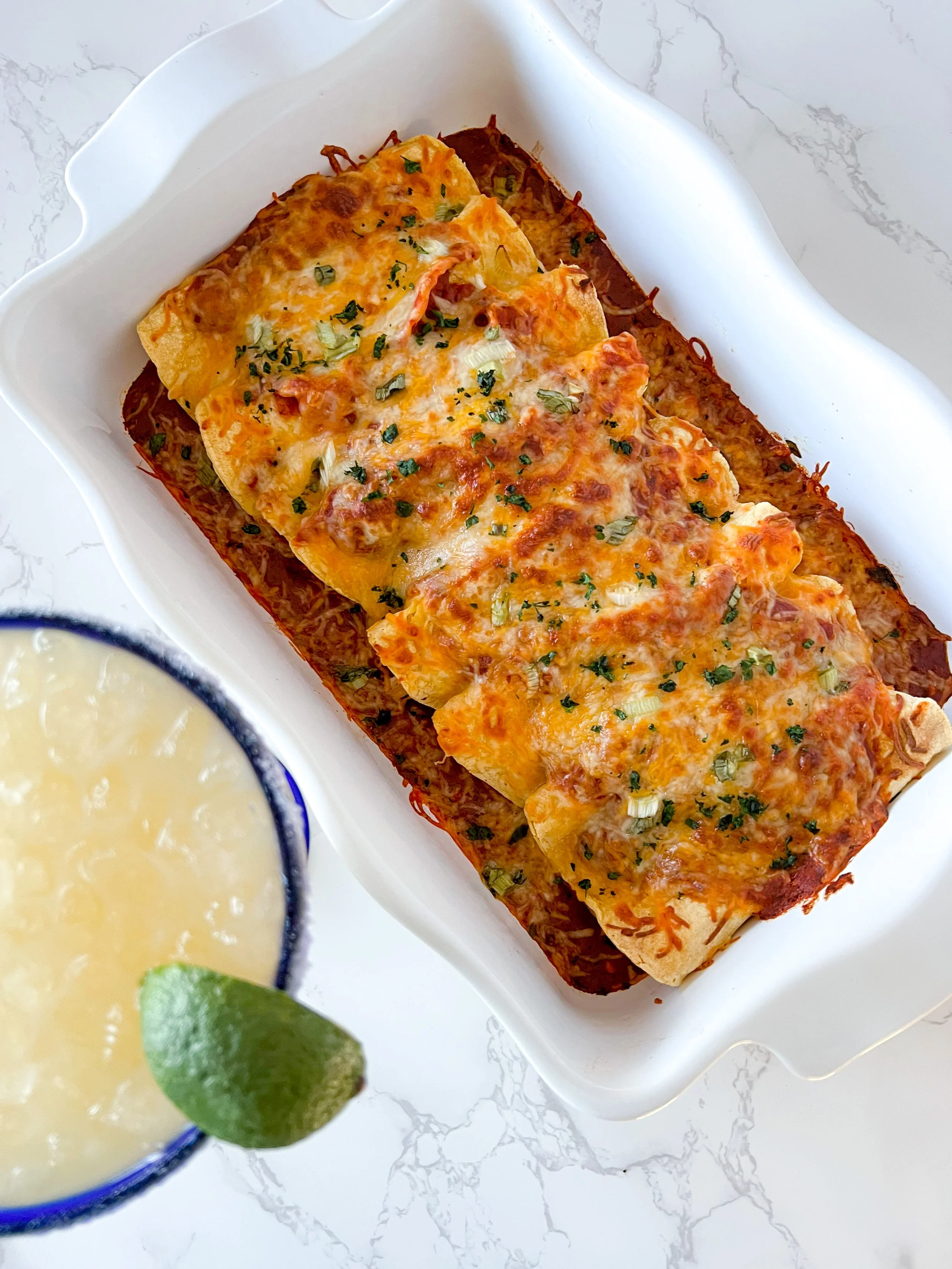 Top the enchiladas with the remaining sauce, cheese and green onions.