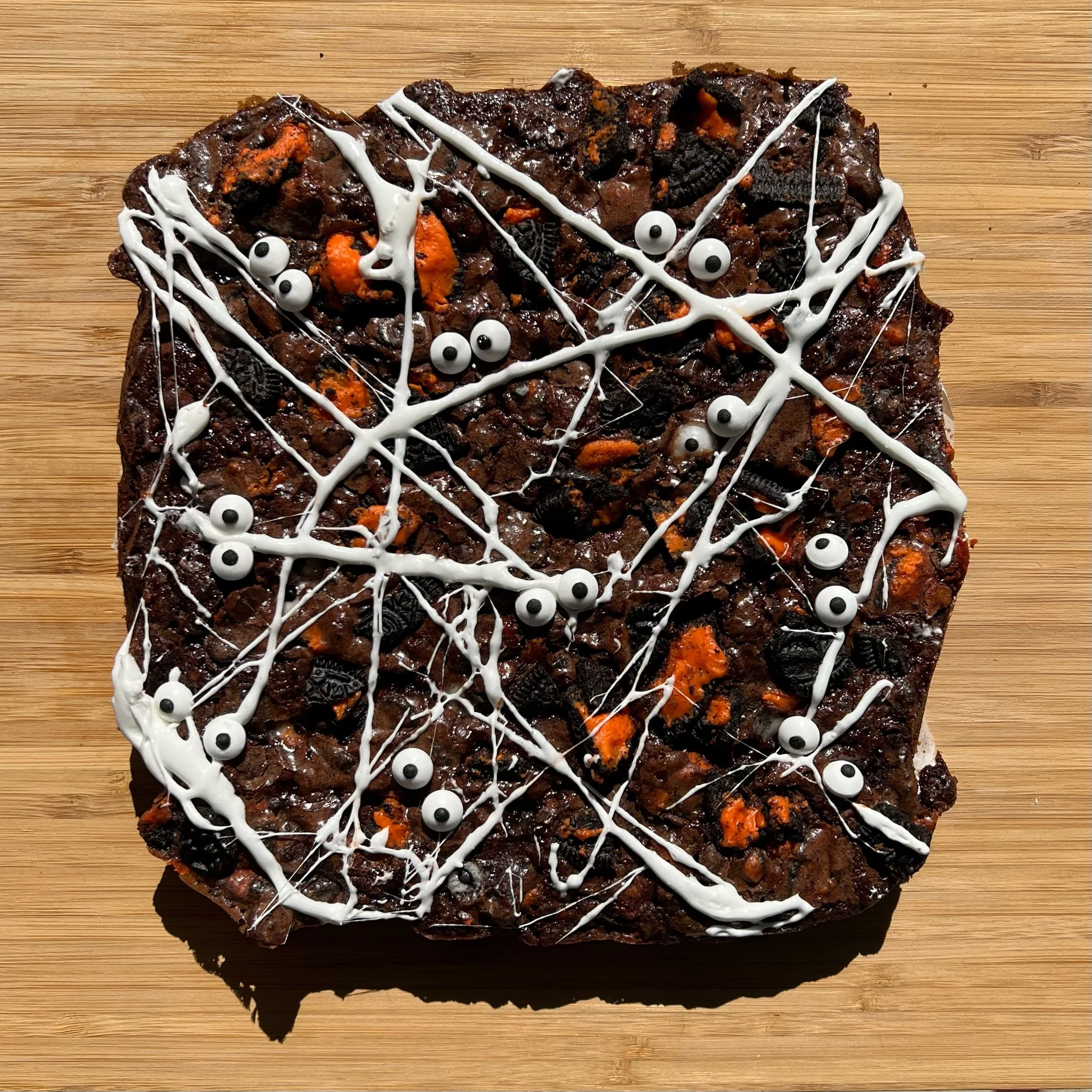 Use your hands to stretch the marshmallow over the brownies to create a web. Place the sprinkles where desired.